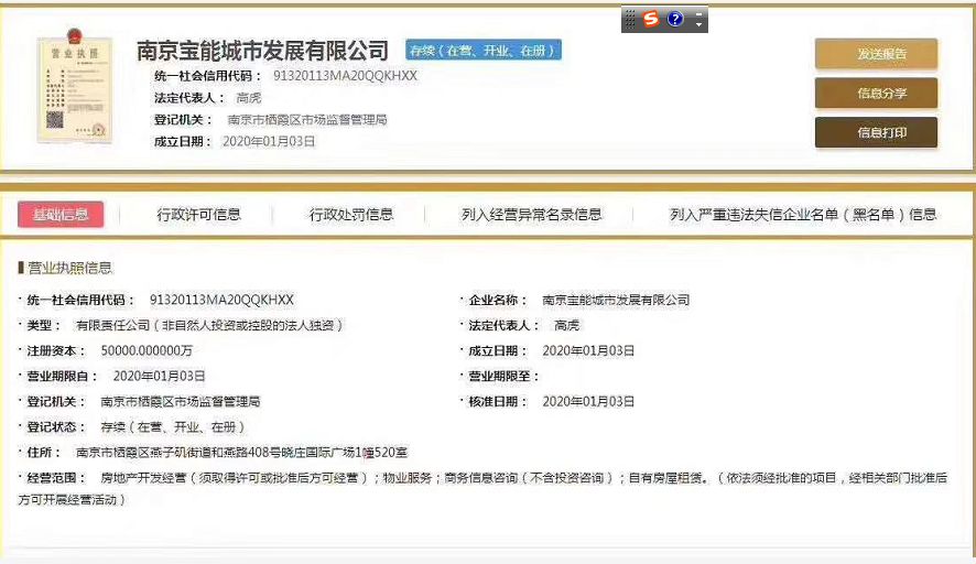 3、该地块一直被视为宝能定制地块,据了解,在今年1月3日南京宝能城市发展有限公司已在栖霞区注册登记,注册资金5亿。